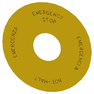 Unterlegschild rund, für NOT-HALT-Pilzdrucktaster, gelb, selbstklebend, Außendurchmesser 75 mm, Innendurchmesser 23 mm, mit Beschriftung: NOT-HALT, EMERGENCY STOP, EMERGENZA, EMERGENCIA 4-sprachig: DE,EN,IT,SP